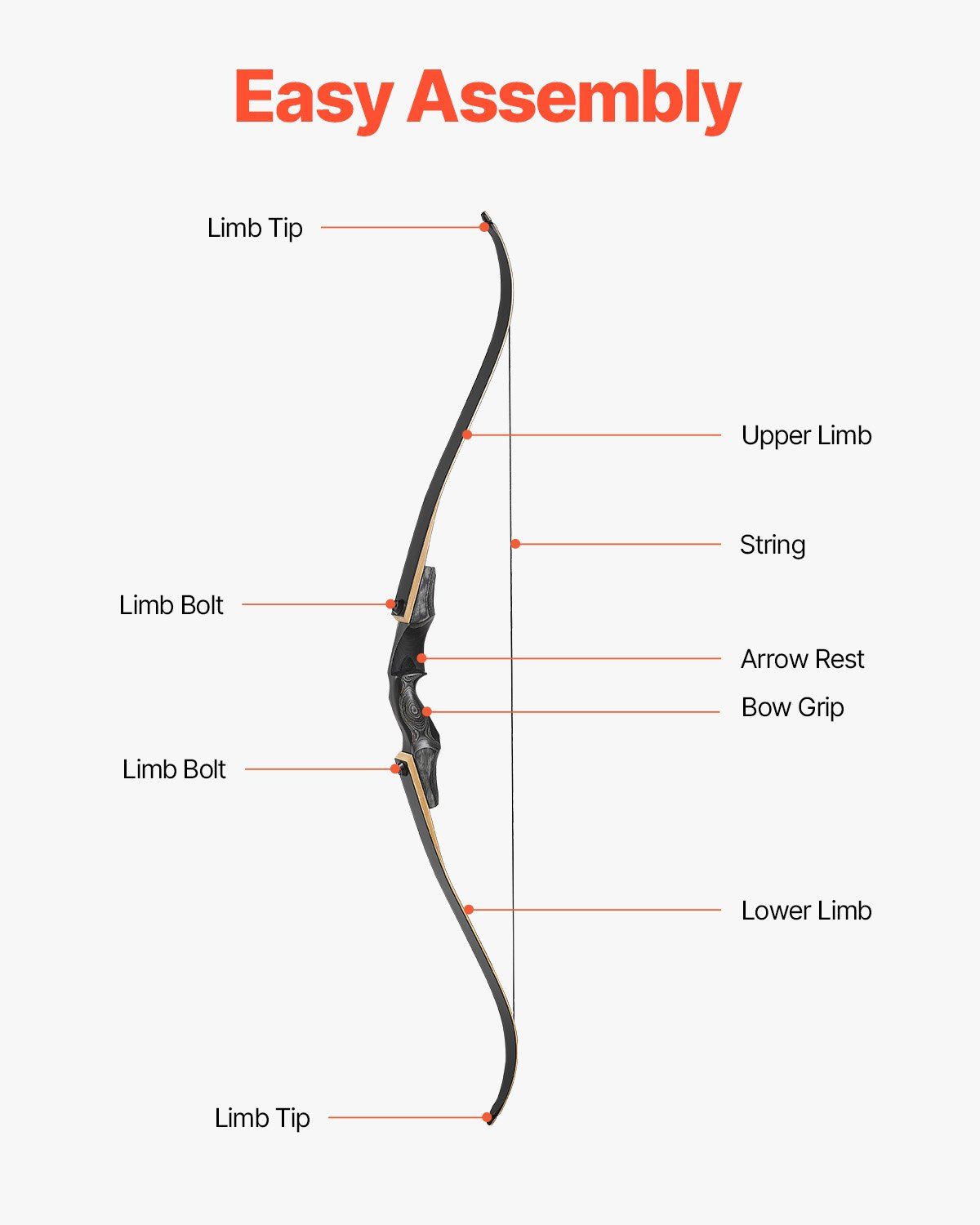 3.Easy Assembly and Disassembly: The takedown recurve bow is simple and convenient to assemble and disassemble. Its user-friendly design makes it easy to perform regular maintenance and transport, ensuring easy storage and secure from bow damage