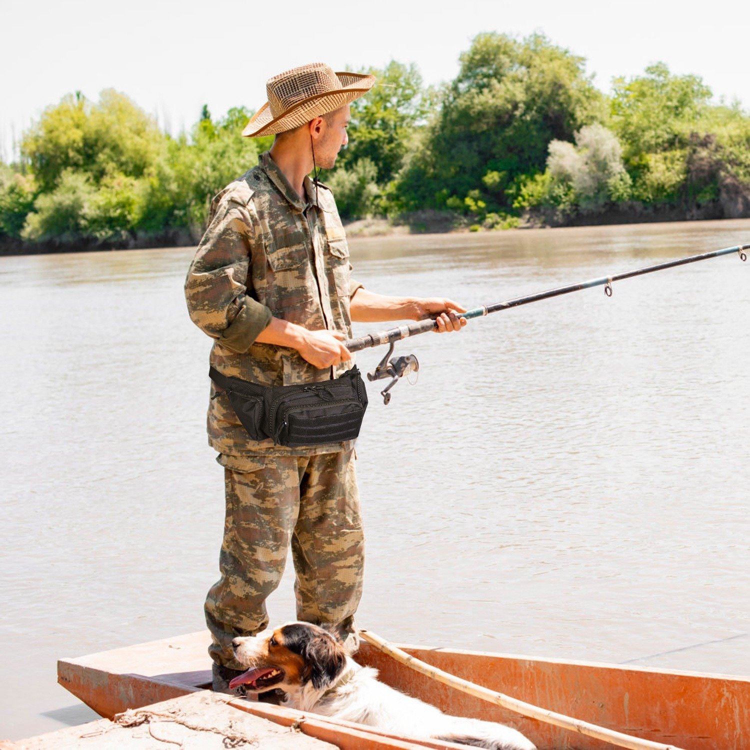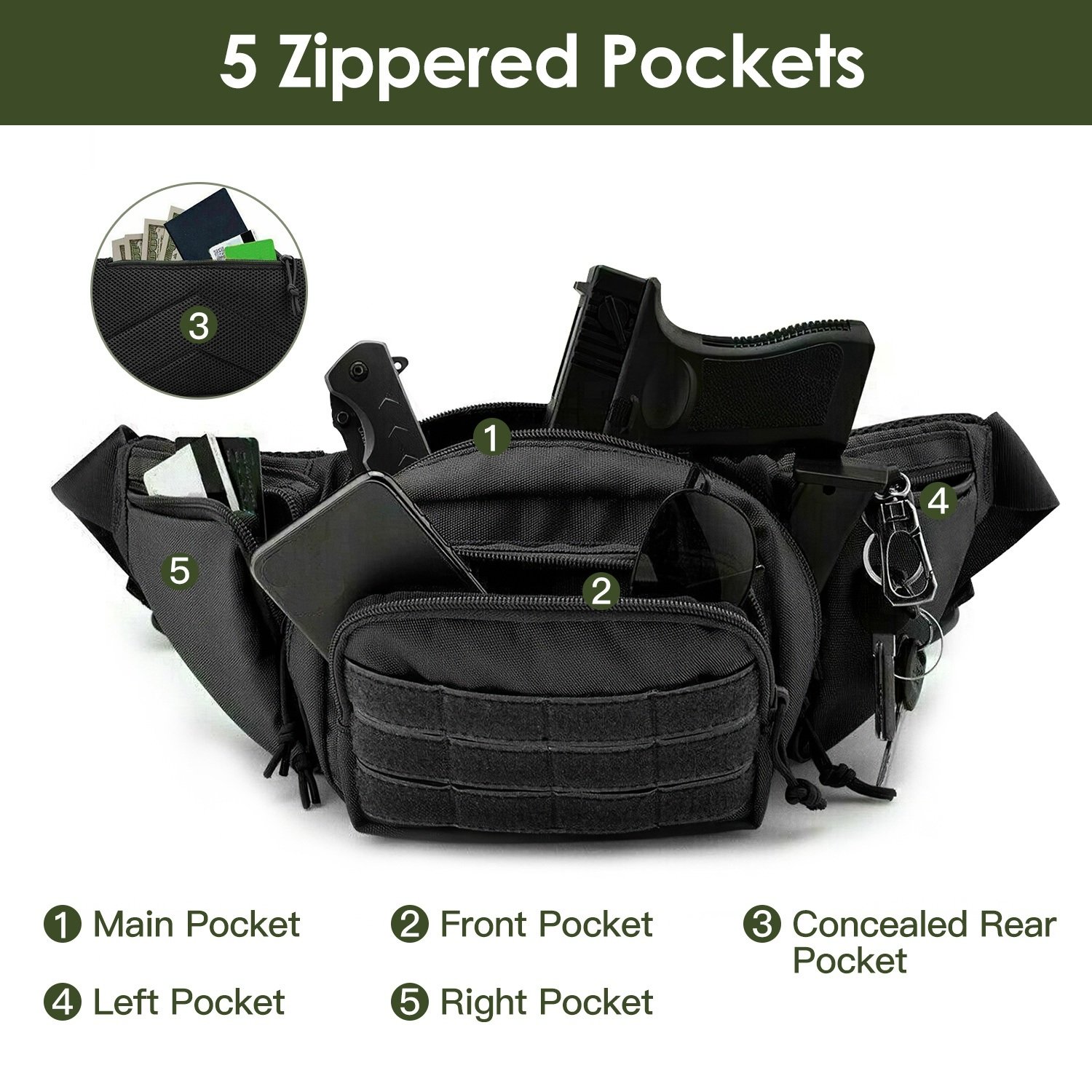 *Ample Storage Space*:Included with 5 zippered pockets,our combat waist bag features a spacious main compartment for keeping larger items like a phone,wallet,and cigarettes safe and secure,a deep rear pocket for smaller personal gadgets such as your passport,ID card,credit card,money or coins. On the front side,there’s an ideal spot for fishing goodies plus 2 small compartments on either side suitable for storing lighters or gum.